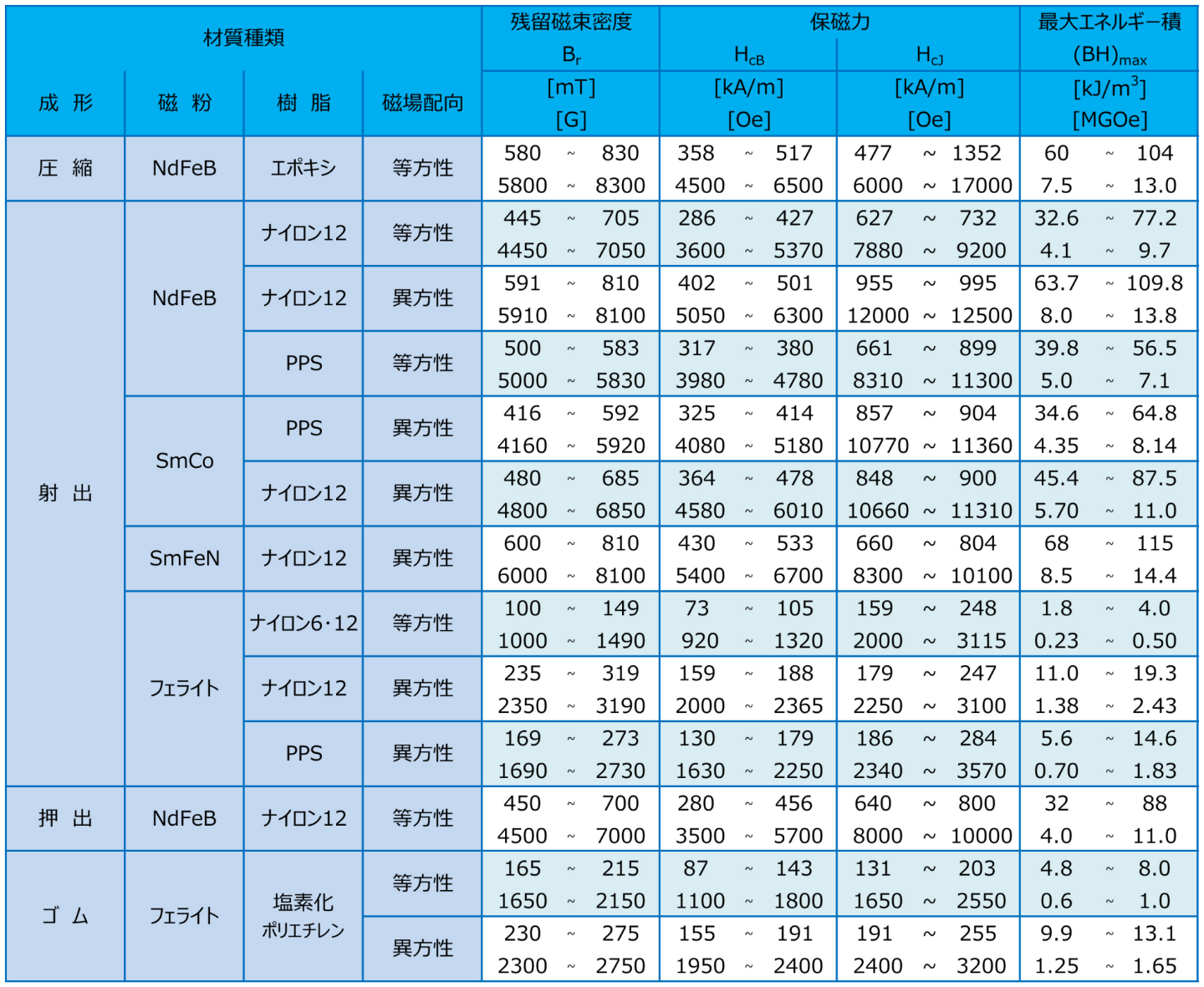 磁性材料は、希土類系(NdFeB、SmCo、SmFeN)、フェライト系の磁粉が一般的に多く使用されています。